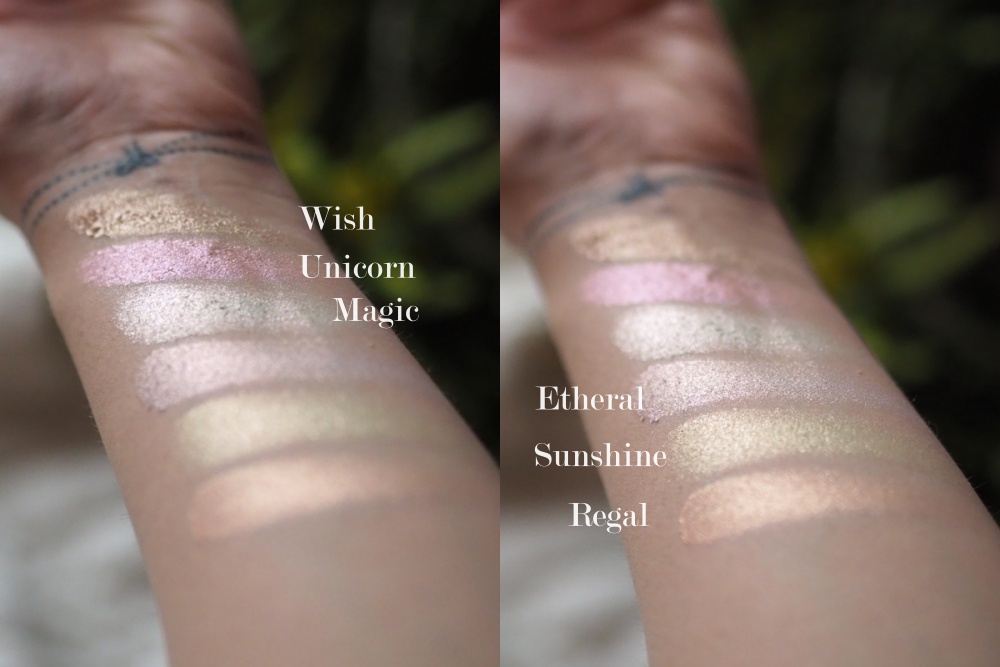Tak jakbyście zamiast sześciu kolorów miały maksymalnie trzy. Unicorn i Etheral wyglądają na policzkach tak samo (lekko różowo-filetowe holo), Wish i Regal niemal wcale się nie różnią (złoto-szampański odcień), Sunshine i Magic to praktycznie to samo (chłodniejszy kolor).