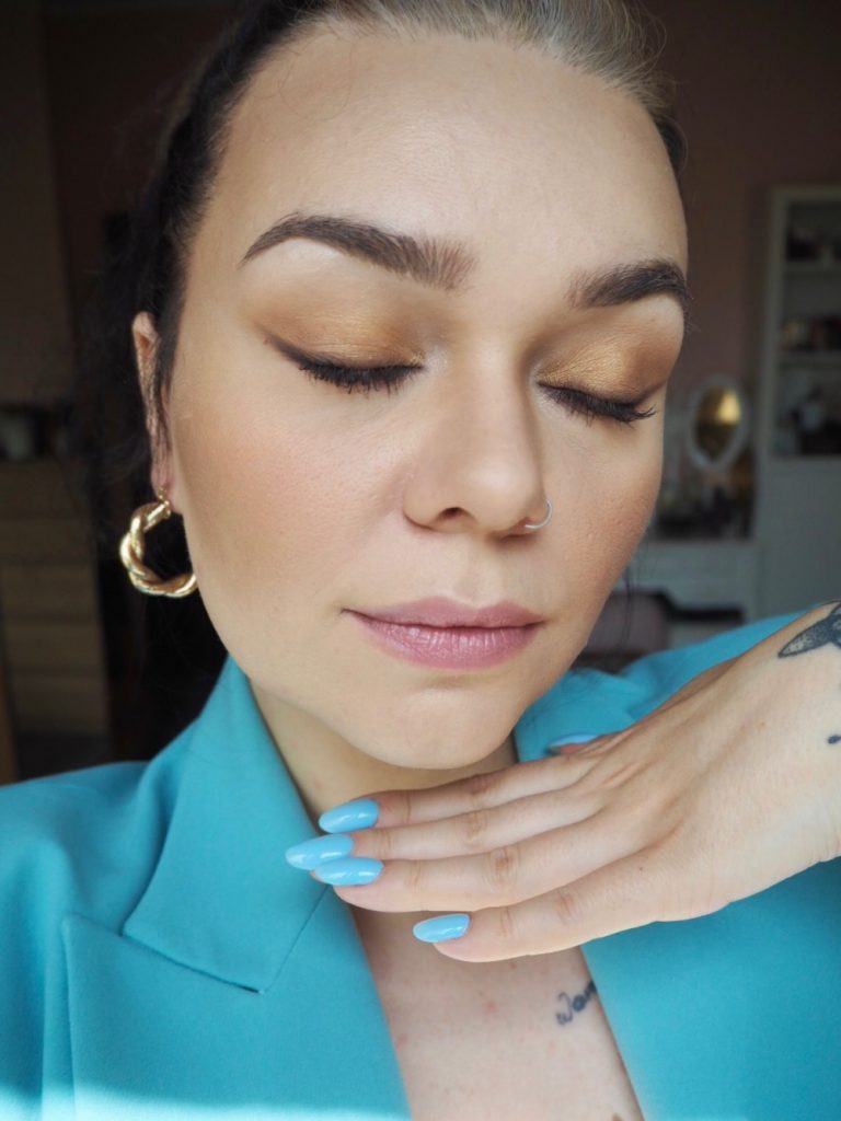 Mojego serca nie podbiło błyszczące złoto, które widzicie na zdjęciu poniżej. Aplikowane palcem, na mokro, nieszczególnie oddaje blask. Jest leki błysk, ale taką mocą metalików mogliśmy się interesować dekadę temu. Lepiej wypada miedź i brudny brąz.