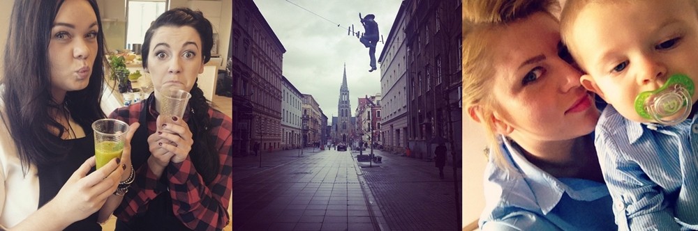 Kilkukrotnie nawiedziłyśmy również stolicę. Co prawda ostatnia wyprawa skończyła się dość dramatycznie (autko Lony znalazło się na cmentarzysku), to my jesteśmy pełne zapału. Podczas warsztatów z beglossy tworzyłyśmy pyszne koktajle w towarzystwie uroczej Klaudii – Kadik Babik. Wysyła Wam minkę smutną, bo właśnie wypiła do dna nasz super hiper shake –przepis znajdziecie tutaj (fotka3). W Katowicach, jak zawsze, romantycznie i bluesowo. Na kultowej Mariackiej mamy swojego grajka, a kto nie wierzy, że w Kato jest pięknie niech spojrzy na zdjęcie (fotka4). Jest i Wasz ulubiony junior-bloger z mamą. Filip i Lona noszą się w w tym samym kolorze. Nie wiadomo, czy młody lubi kołnierzyki, ale liczy się stylówa, a co(fotka5).