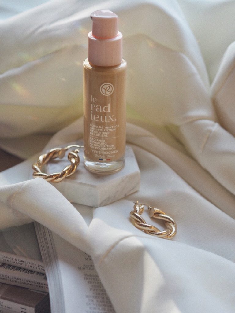 Podkład Yves Rocher pochodzi z Bretanii, z miejsca znanego Blessom, bo w zeszłym roku miałyśmy szansę je poznać osobiście. Co oczywiście miło nastawia. Ma szklany flakonik z pompką, wegańską formułę, ponad 80% składników pochodzenia naturalnego. Używam koloru Beigie 100.