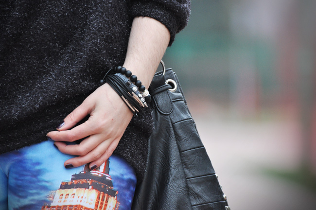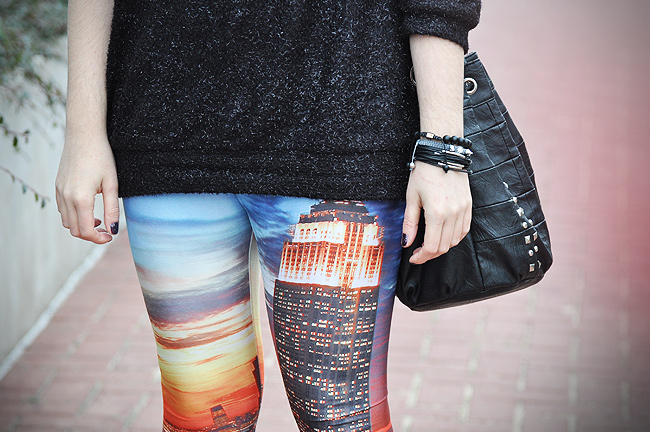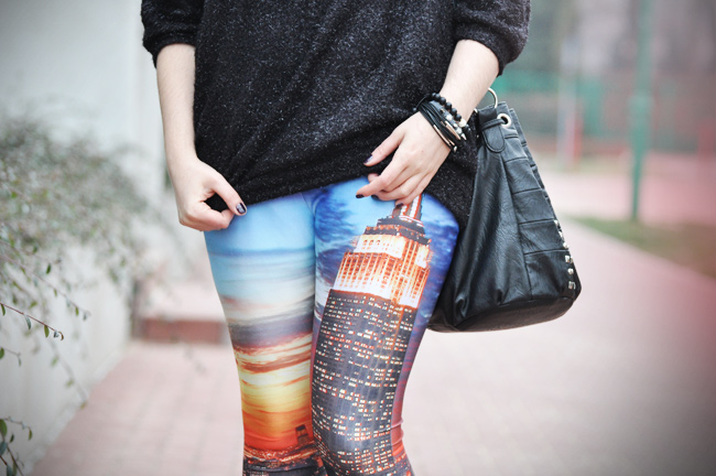 Póki co jednak wieść muszę życie bardziej przyziemne, a marzenia (nawet te od Męża) realizować w sposób…niezwykły. I tak na mych nogach zagościł Nowy Jork. Wszystko za sprawą znanych Wam pewnie printów, od których w ostatnich miesiącach kręci się w głowie niejednemu. Moje legginsy przybyły z Romwe. I wraz z oversizowym cudnym sweterkiem od Joanny R.Wodzińskiej rozświetlają końcówkę roku. Bo choć tego nie widać tak dobrze na fotografii, to te jasne nitki na sweterku cudownie błyszczą… Niczym fajerwerki! A przywitać nowy rok w świetle sztucznych ogni w mieście Wielkiego Jabłka..To by było coś!