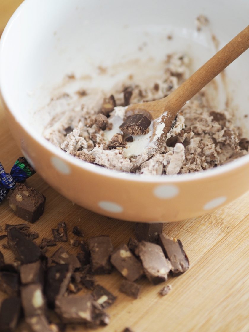 Mieszamy serek mascarpone z rozdrobnionymi Michaszkami.