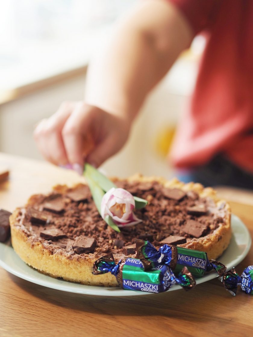 Po wyciągnięciu z piekarnika ciasto powinno się wystudzić, ok. 15 minut. Nanosimy przygotowany krem, ozdabiamy wierzch Michaszkami Original i ewentualnie polewamy delikatnie kwaśną konfiturą porzeczkową. Voila!