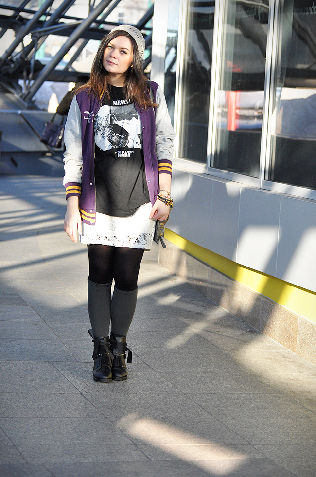 nn t-shirt Nirvana | Vero Moda dress | H&M beanie, jacket | E-Lady knee socks, tights | Monnari bag | Manufaktura Niebanalna bracelet | ButTrends.com boots