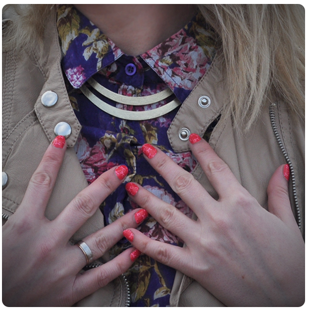 Mam na sobie ubrania, które bardzo, bardzo lubię – magentową trapezową spódniczkę, która pasuje do wszystkiego, wyszperaną na Allegro za niecałe 20 zł kwiatową koszulę, piękną kolię z By Dziubeki, no i ulubione rockowe botki z Fleq.pl. A żeby było jeszcze więcej cukru w cukrze, na paznokciach mam różowe kokardki. Non stop color i do przodu. Wiosna czeka, słońce świeci, a Kasia Tusk i feministki maja się dobrze 🙂