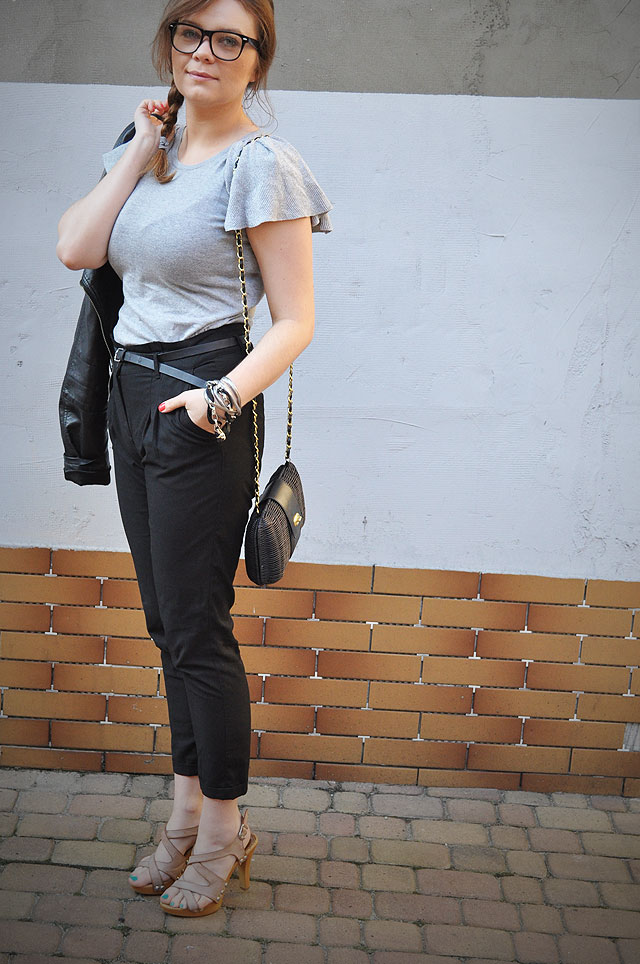 Oto moja wersja „office looku„. Gdybym przeprowadziła się do Londynu i każdego ranka zamiast mknąć drogami Katowic i Sosnowca, jechałabym metrem na Canary Wharf, to właśnie tak chciałabym nosić swój uniform. Elementy eleganckie zmiksowane z rockowymi dodatkami to jedyne możliwe wyjście dla Brytyjki. I dla mnie, a co! By wieczorem wpaść na szybkie piwo do jednego z pubów albo przypadkiem załapać się na koncert wschodzącej gwiazdy indie.. Ach! Rozmarzyłam się. W podskokach kończę i zostawiam z mą bardziej oficjalną wersją.
